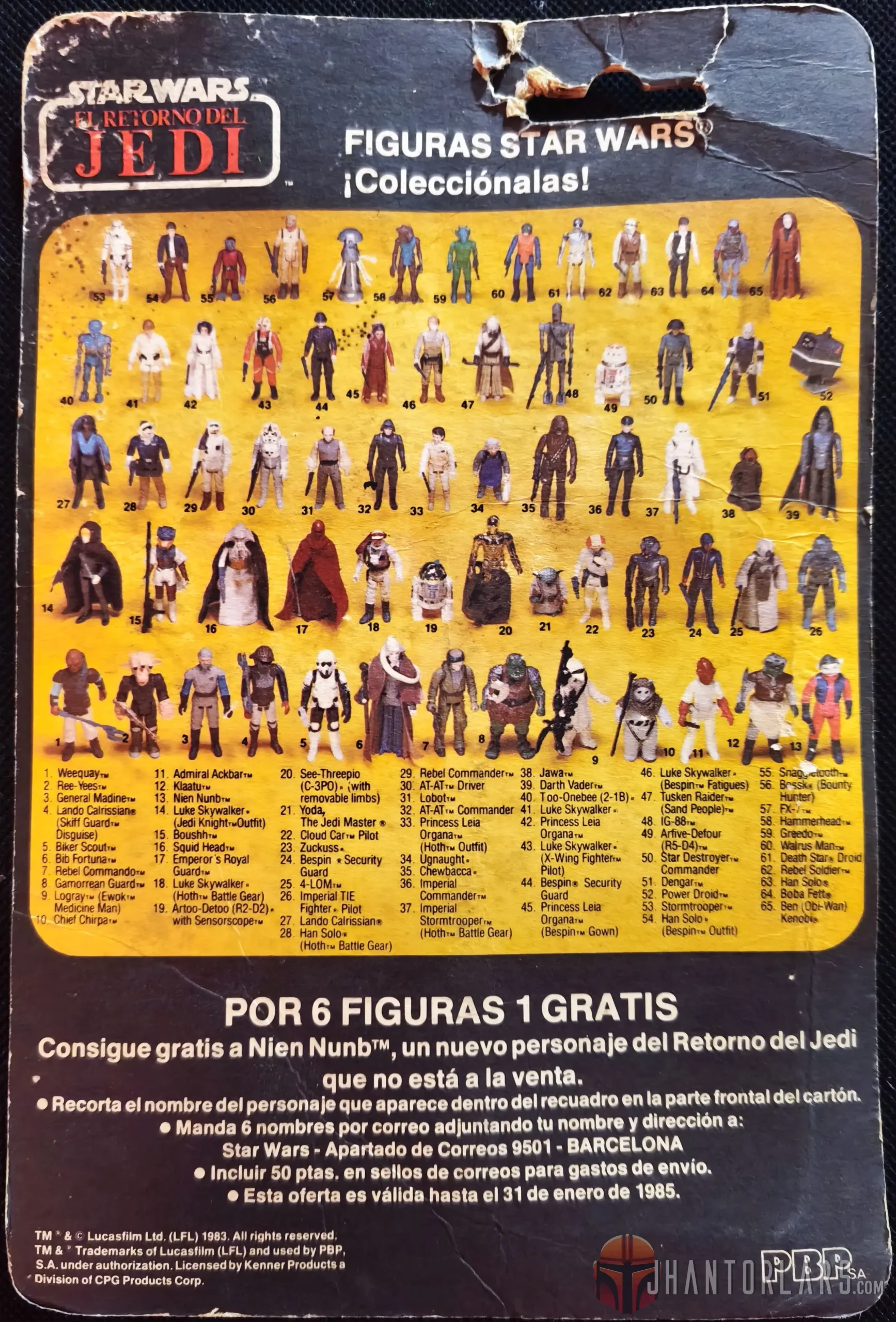 PBP era el minorista español de Star Wars vintage y, como tal, este cartón está escrito principalmente en español. Muestra la misma imagen que la utilizada en los cartones posteriores de Kenner 65, pero tiene una oferta de correo para Nien Nunb.