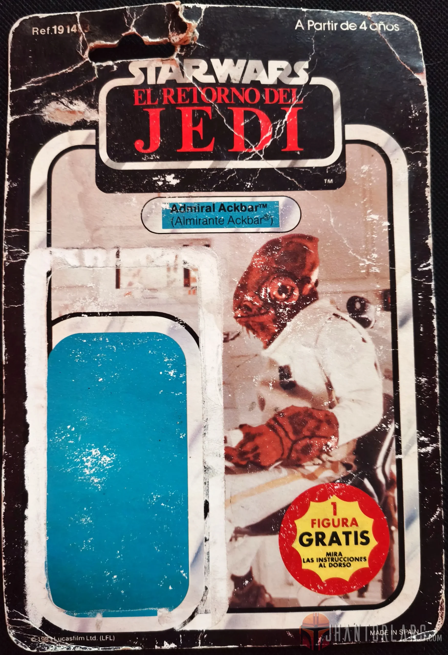 Este cartón también tiene la etiqueta adhesiva del catálogo que se adhiere a la mitad inferior del cartón. Sin este autoadhesivo sería un cartón 65 de Palitoy, con las dos figuras de ewok oscurecidas.