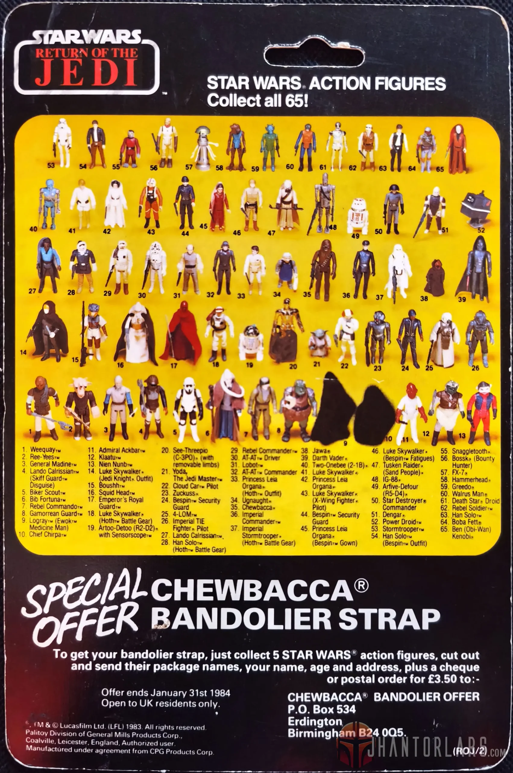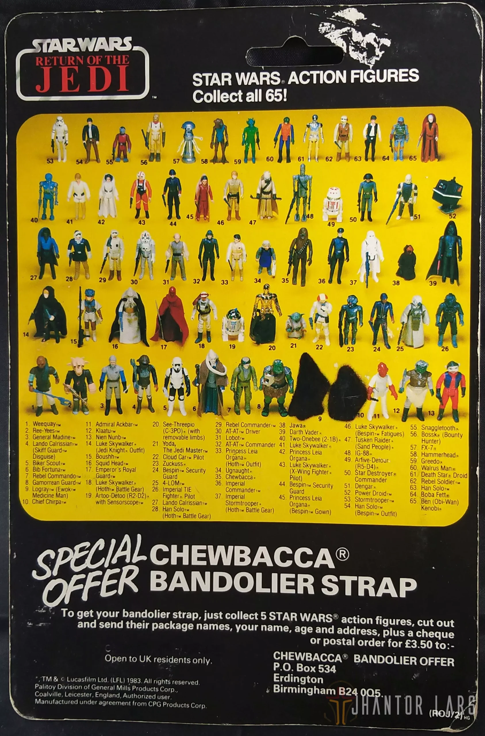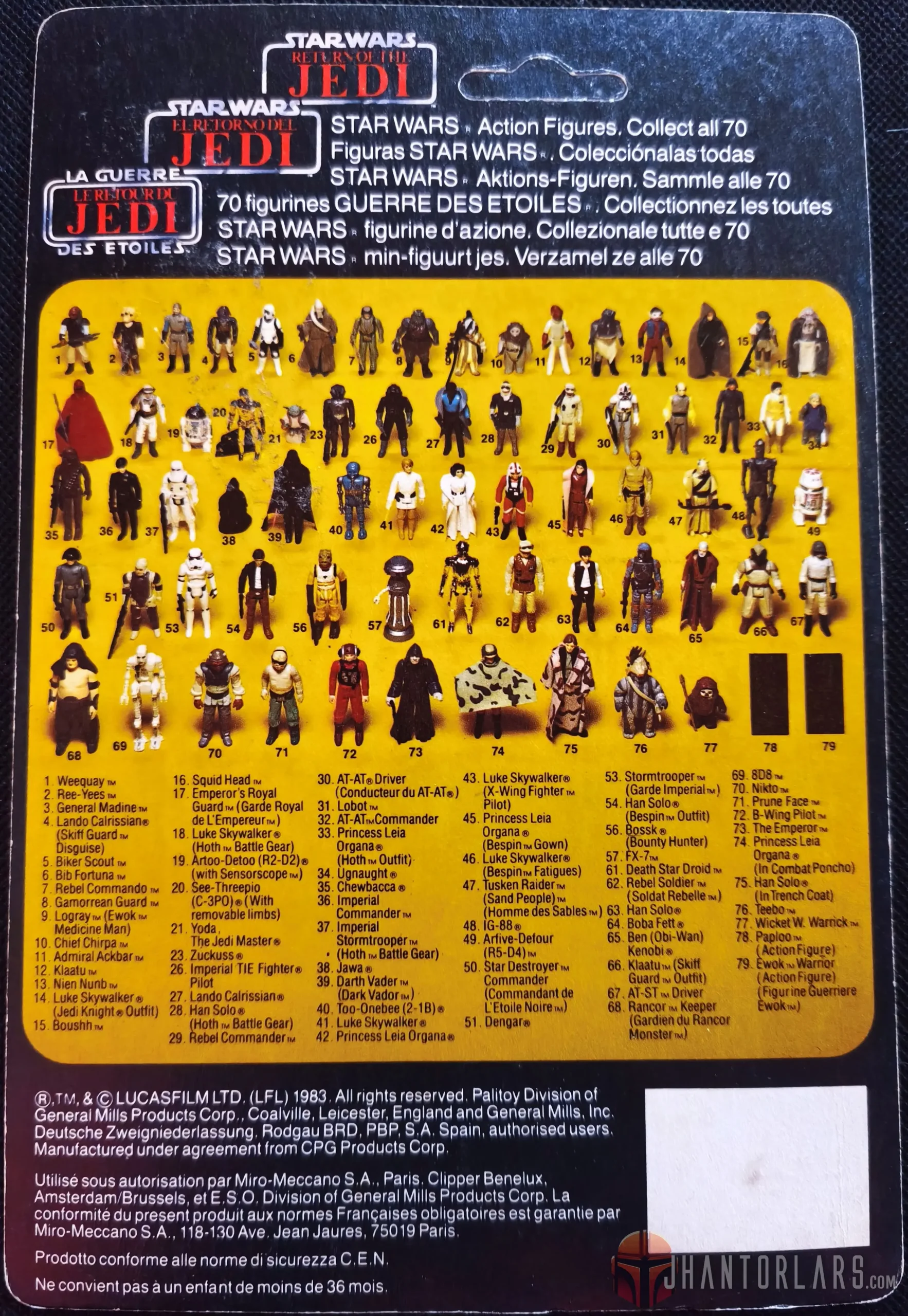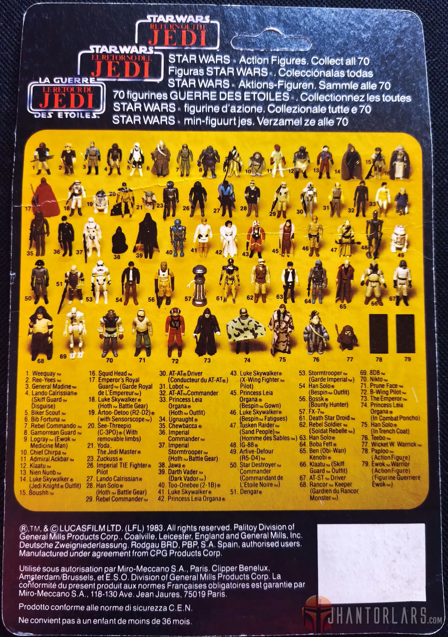 Las figuras vintage de la colección de Star Wars Return of the Jedi parten en la 45 para algunas licencias, mientras que para otras en las 12, llegando hasta las 79 figuras de las tres películas. Fue en esta colección que además aparecen dos rarezas para los coleccionistas, como son el cartón de Harbert con el pegamento UHU, además de las figuras que se vendieron en conjunto con la pasta de dientes Colgate. Al cierre de esta colección en la línea Palitoy y PBP – Posh aparecieron los cartones Tri-Logo. Por último, en esta colección es cuando aparece una serie particular de bootleg que muchos coleccionistas buscan, los de Uzay.
