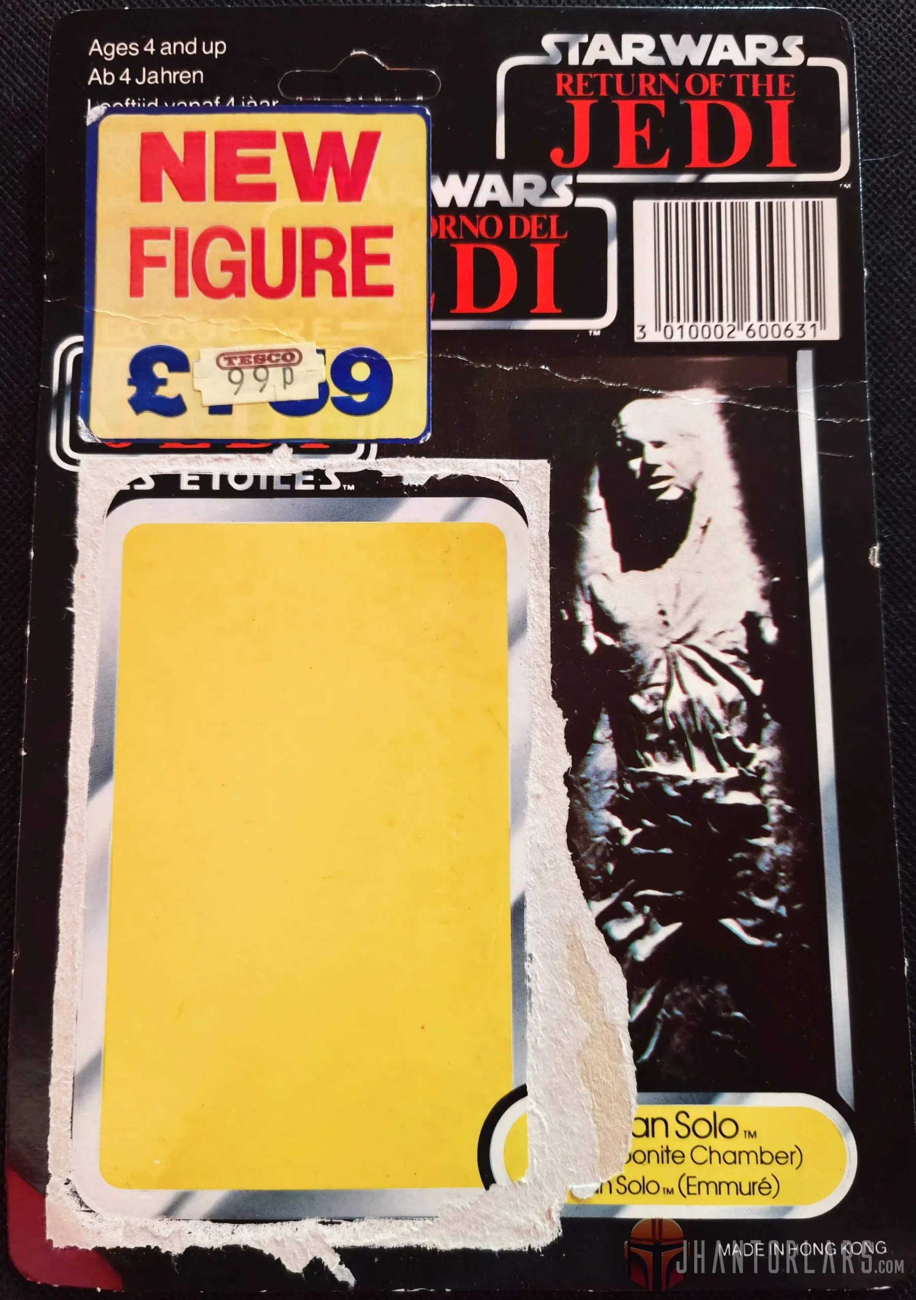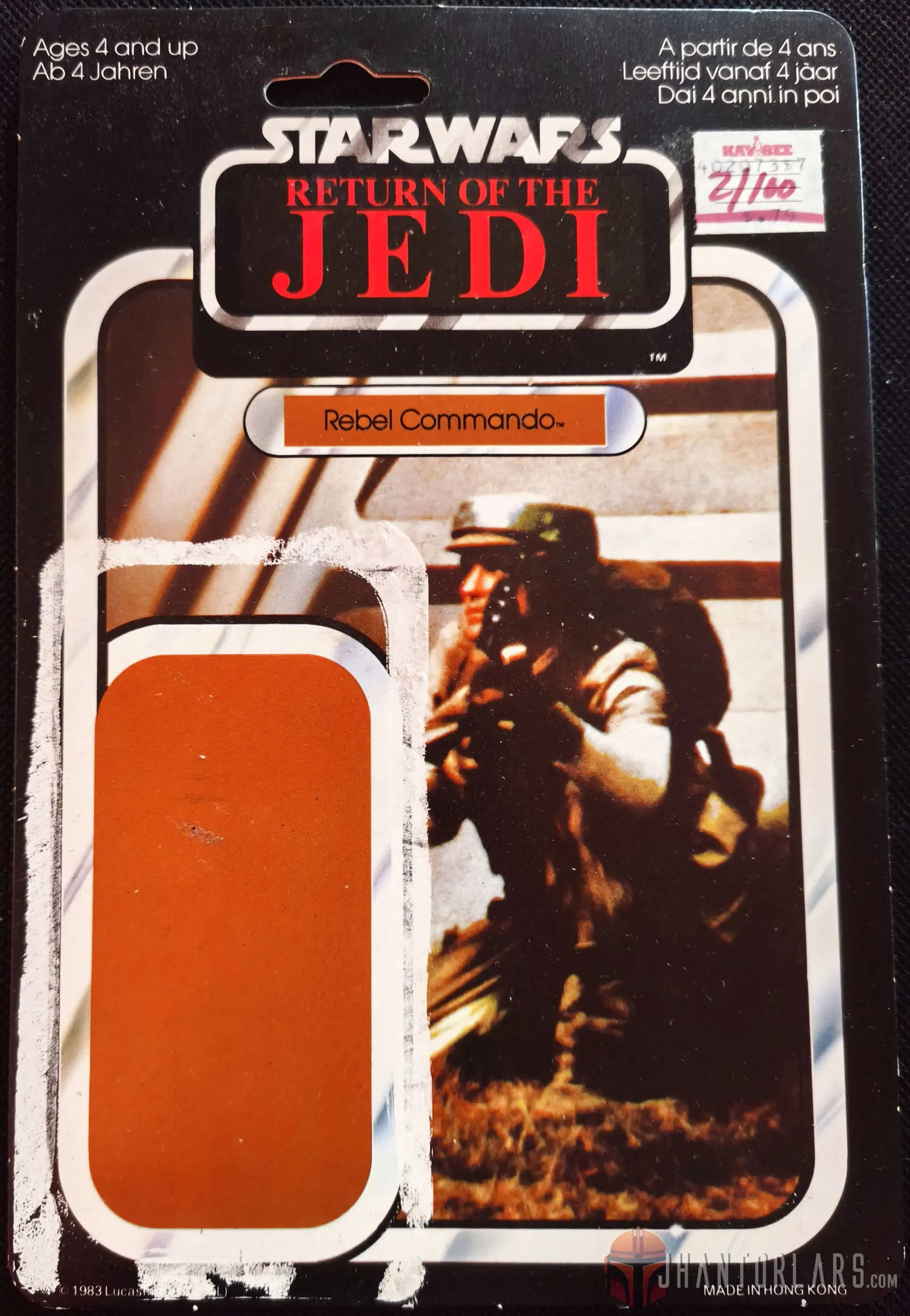 Este cartón apareció con el lanzamiento de las primeras diecisiete figuras de la película Return of the Jedi. Se presenta el logotipo de la película en la parte superior del cartón con un área de borde negro debajo, similar a las tarjetas 45B ESB. La advertencia de “mayores de 4 años” en el frente se muestra en cinco idiomas (inglés, alemán, francés, holandés/flamenco e italiano), lo que indica que estos cartones tenían una amplia distribución a través de Europa continental, así como en el Reino Unido. Esta característica puede haber sido una precursora de los cartones 77 Back Tri-logo, que presentaron el logotipo de la película en tres idiomas. La parte frontal del cartón no posee el logotipo de Palitoy.