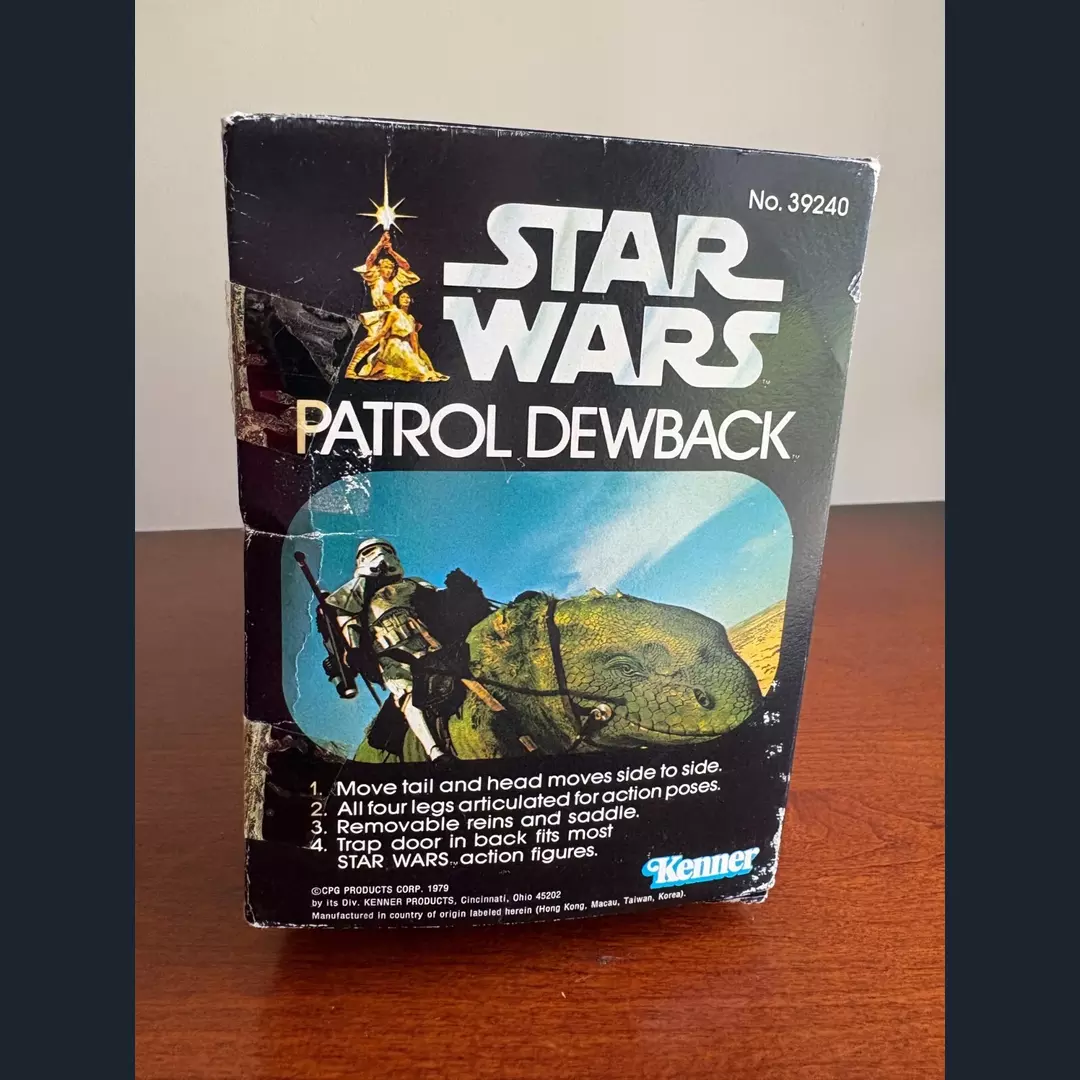 En el folleto Kenner de 1979 aparece el Patrol Dewback con una forma similar a la figura final, pero un poco más robusta y que se aprecia menos amigable, esencialmente por su color y en particular por la posición y estructura de sus patas. Un cambio esencial respecto al prototipo es el movimiento ligado de la cola con la cabeza. Mientras en el prototipo el movimiento era vertical, en la figura final es horizontal. Esta fotografía no es la que aparece en la caja del juguete.